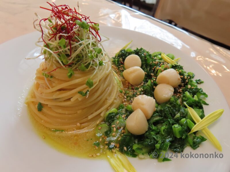 この日のパスタは菜の花と貝柱のパスタ 丁寧に盛り付けられたパスタが可愛いい。また菜の花の香りと食感、貝柱のプニプニ感がパスタとベストマッチ♪味付けも最高に美味しかったです✨