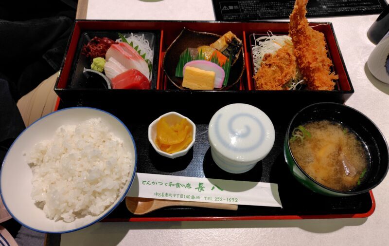 長八定食。お刺身、焼き魚、煮物、フライ(海老とひれかつ)、茶碗蒸しがついたランチ。