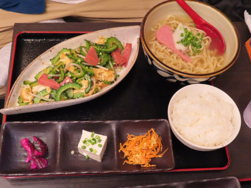 ランチのゴーヤチャンプルー定食。プラスでおそばをつけました。